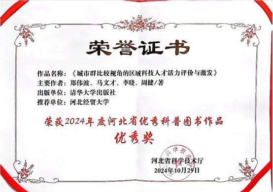 近日,必赢线路检测中心郑伟波教授主持撰写的科研专著《城市群比较视角的区域科技人才活力评价与激发》(清华大学出版社,2023)荣获2024年度河北省优秀科普图书作品优秀奖。