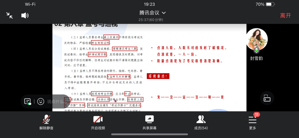 封雪韵聚焦《河北经贸大学普通本科教学考务管理制度》,从考场规则、监考与巡视和考试纪律等3方面带领全体教师认真学习《制度》的第五、六、七章。她首先详细解读考场规则,对考场环境布置、考生座位安排、考试时间把控等细节进行明确规范,确保考试的严肃性与规范性。然后,她详细讲解了监考教师的监考职责与工作流程,从考前检查、证件核对,到考中监考、突发事件处理,以及巡视员的巡查重点与路线规划,确保全方位保障考试秩序。在考试纪律部分,她着重解读违纪和作弊的认定办法,帮助老师们清晰界定如携带违规物品、抄袭、协助作弊等各类行为的表现形式与判别标准,有利于大家准确把握尺度,做到纪律严明、评判有据。