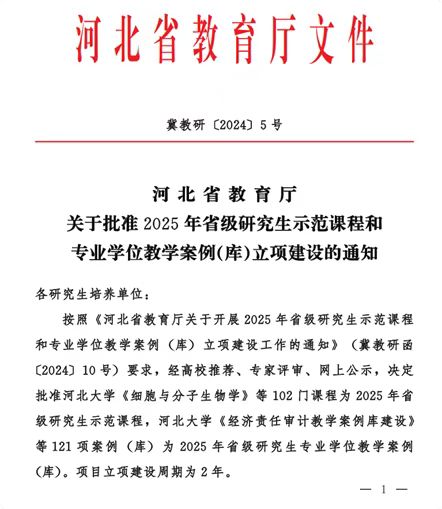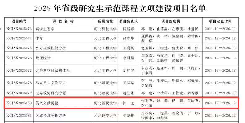 近日,河北省教育厅公布了2025年省级研究生示范课程和专业学位教学案例(库)立项建设名单。必赢官网共获批2项,其中研究生示范课程1项,专业学位教学案例(库)1项。