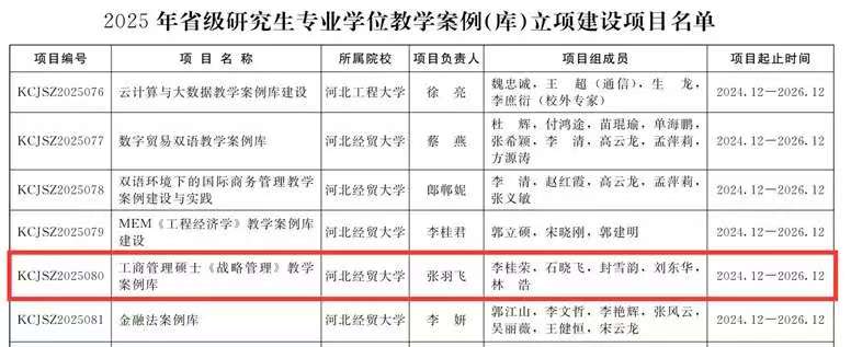 必赢官网教师许龙副教授主持的《英文文献阅读》获批2025年省级研究生示范课程立项和张羽飞博士主持的《工商管理硕士<战略管理>教学案例库》获批2025年省级研究生专业学位教学案例(库)立项建设项目。