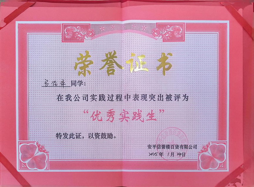 这次实习,对我来说是一次意义非凡的成长历练,让我从一个有点社恐、不太自信的学生,逐渐变得开朗、主动。并且也非常荣幸地获得了信誉楼颁发的优秀社会实践生证书。这份荣誉不仅是对我实习期间努力的肯定,更是激励我不断前行的动力。它让我明白,只要用心去做,就会得到认可。我相信,这些收获会成为我未来职业道路上的有力支撑,让我走得更稳、更远。