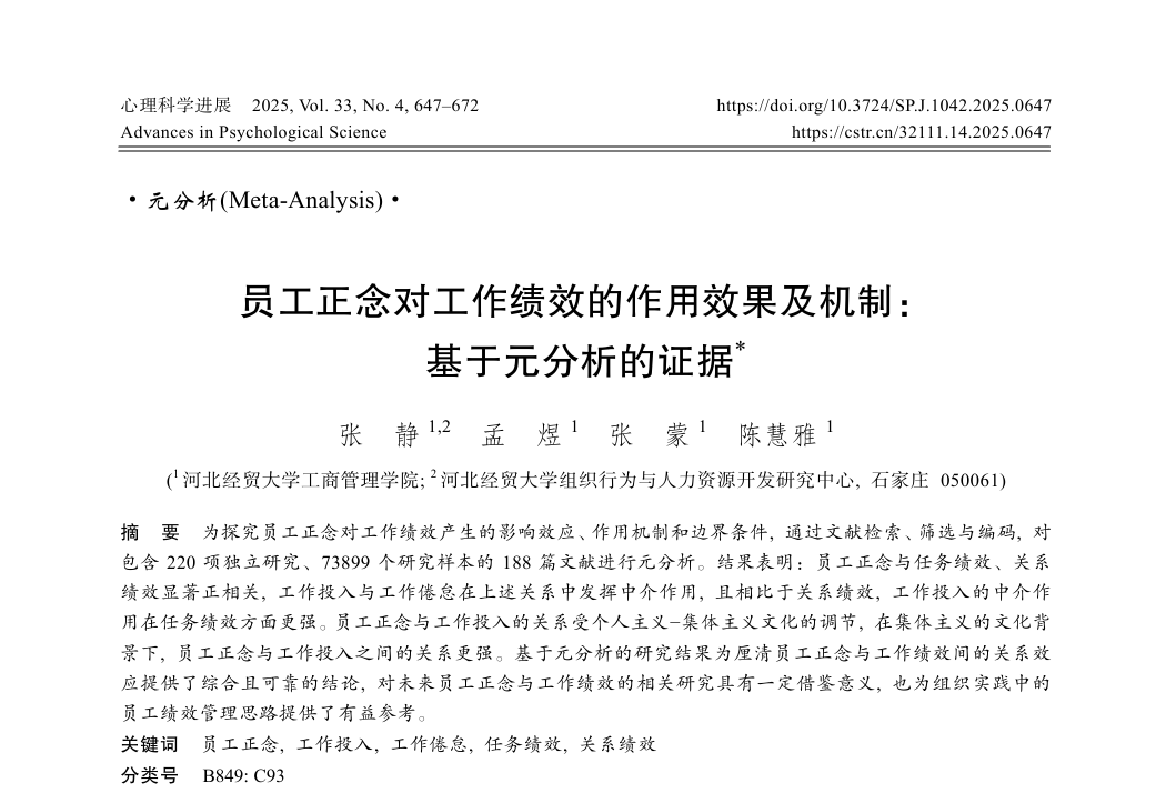 近日,必赢线路检测中心张静副教授、张蒙博士和研究生孟煜、陈慧雅的研究成果《员工正念对工作绩效的作用效果及机制:基于元分析的证据》在《心理科学进展》期刊2025年第4期发表。