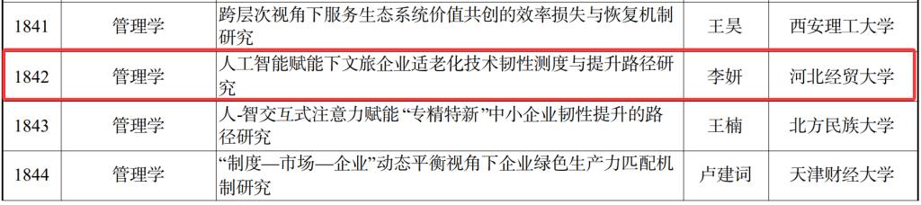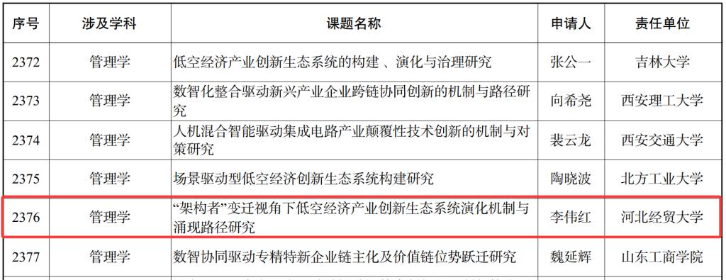9月5日,全国哲学社会科学工作办公室发布《关于2025年国家社会科学基金年度项目立项名单的公示》,437必赢会员中心李伟红教授主持的《“架构者”变迁视角下低空经济产业创新生态系统演化机制与涌现路径研究》项目获国家社科基金一般项目立项、李妍博士主持的《人工智能赋能下文旅企业适老化技术韧性测度与提升路径研究》项目获国家社科基金青年项目立项。