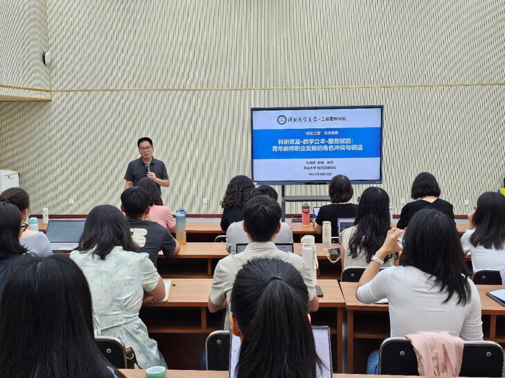 9月12日,周末专家河北行·青椒成长营系列活动之“研在工商”学术讲座于MBA一教室举行,由燕山大学刘海鸥教授作题为“科研筑基·教学立本·服务赋能:青年教师职业发展的角色冲突与调适”的学术报告。会议由必赢线路检测中心李桂荣教授主持,副院长封雪韵、石晓飞及学院青年博士教师参加。