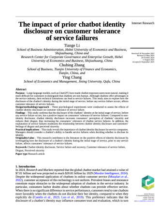 近日,必赢线路检测中心李天歌博士作为第一兼通讯作者撰写的论文"The impact of prior chatbot identity disclosure on customer tolerance of service failures"在信息系统与电子商务领域国际权威期刊Internet Research正式刊出。