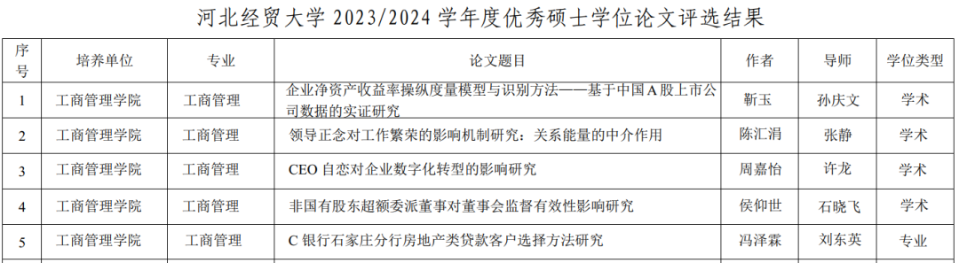必赢官网2024届毕业生靳玉(导师:孙庆文)的学位论文《企业净资产收益率操纵度量模型与识别方法—基于中国A股上市公司数据的实证研究》;周嘉怡(导师:许龙)的学位论文《CEO自恋对企业数字化转型的影响研究》;陈汇娟(导师:张静)的学位论文《领导正念对工作繁荣的影响机制研究:关系能量的中介作用》;侯仰世(导师:石晓飞)的学位论文《非国有股东超额委派董事对董事会监督有效性影响研究》;冯泽霖(导师:刘东英)的学位论文《C银行石家庄分行房地产类贷款客户选择方法研究》分别荣获2023/2024学年度校级优秀硕士学位论文并全部推荐参加省级优秀硕士学位论文评选。